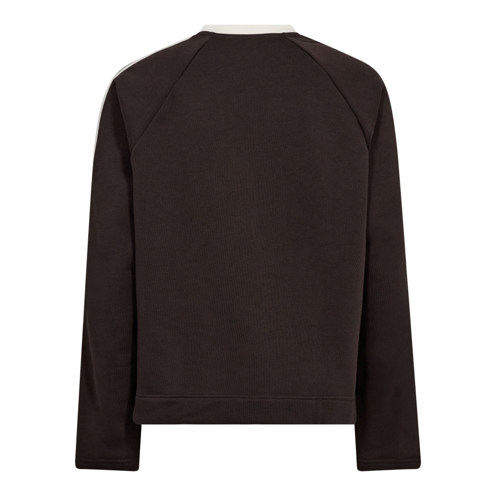 Een donkerbruine sweatshirt met V-hals van Co´Couture met witte strepen langs de mouwen aan de voorkant. De sweatshirt heeft een losse pasvorm en is heerlijk zacht.