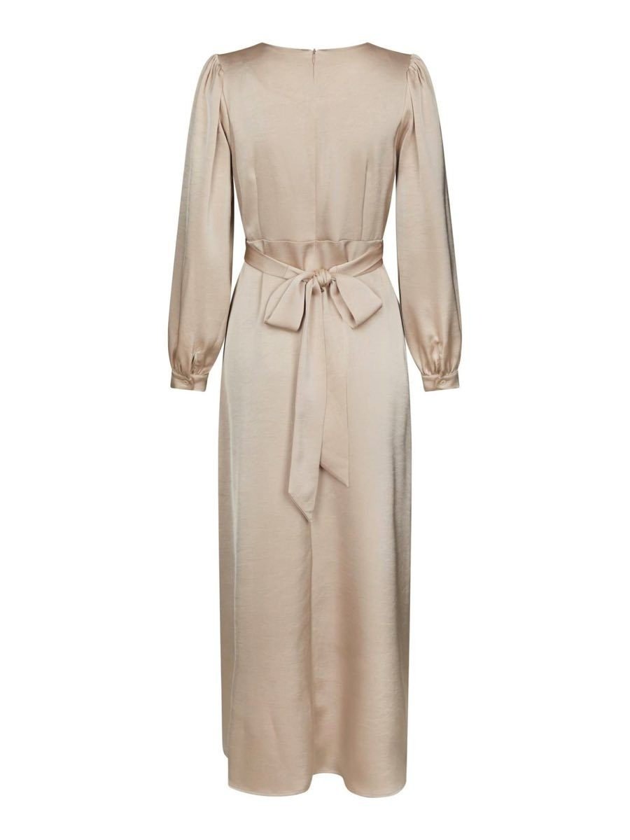 De champagnekleur geeft de jurk een zachte, warme toon die perfect past bij zowel feestelijke gelegenheden als formele events. Dankzij de hoogwaardige stof valt de jurk soepel langs het lichaam, terwijl de structuur tegelijkertijd zorgt voor een mooie, flatterende pasvorm.