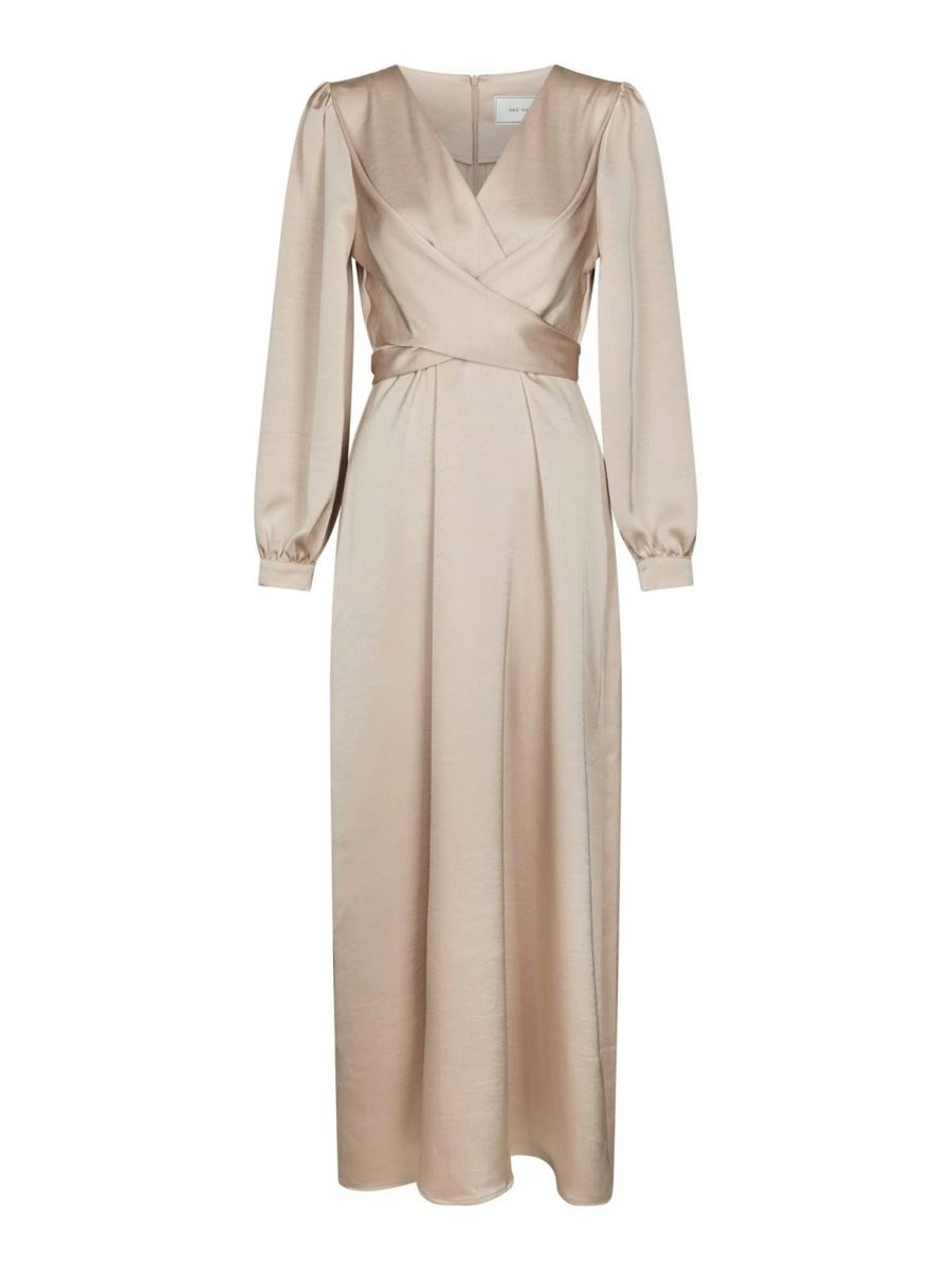 De Bretti Heavy Sateen Dress in de kleur champagne is een elegante en tijdloze jurk die luxe en verfijning uitstraalt. Gemaakt van een stevige satijnen stof (heavy sateen), heeft de jurk een subtiele glans die het licht prachtig vangt en zorgt voor een chique uitstraling.