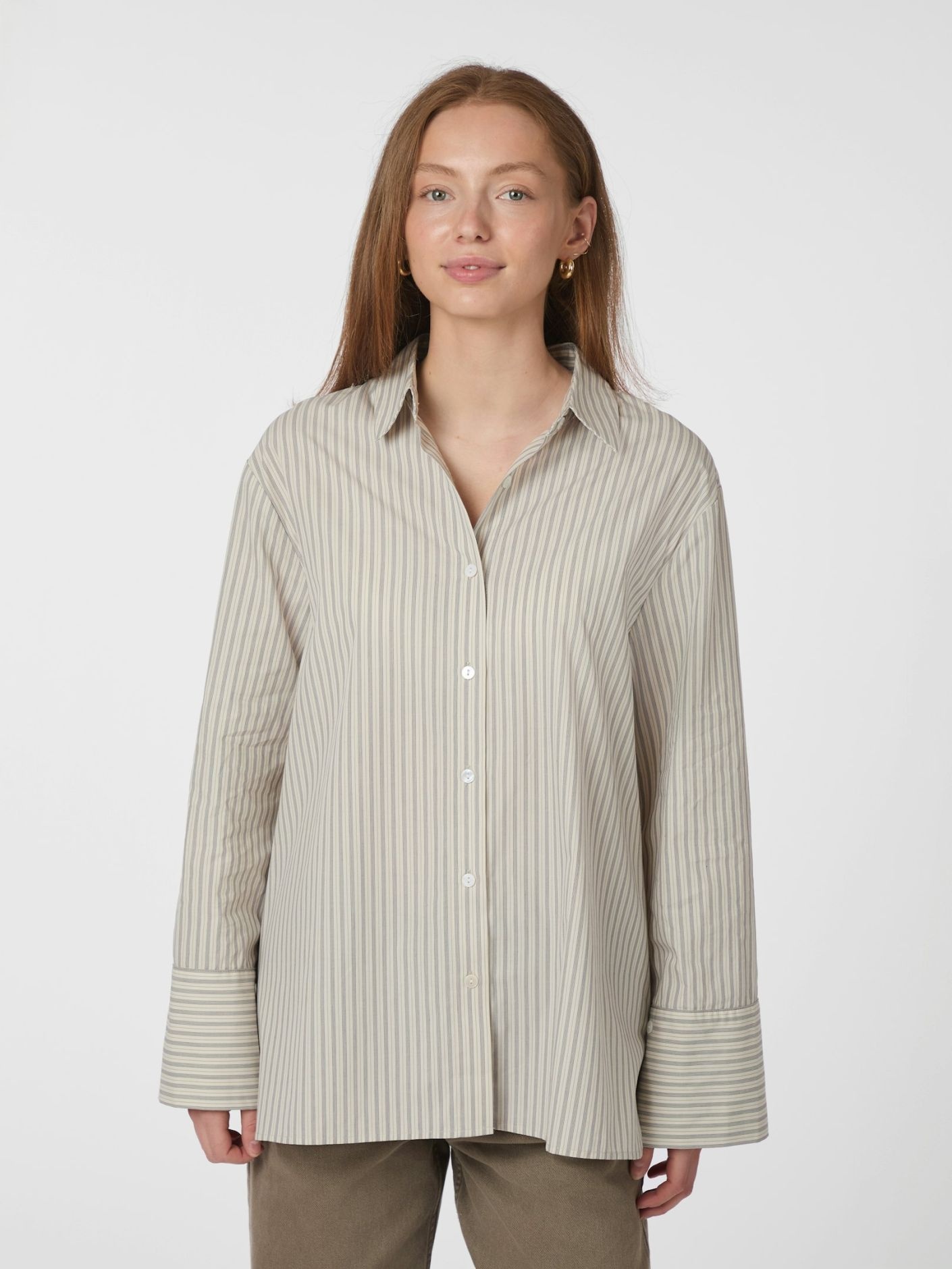 Blouse met lange mouwen, gesmokt lijfje, volantdetail in de halslijn en knoopsluiting in de nek. De lange mouwen zijn even wijd afgewerkt met een geplooide manchet.