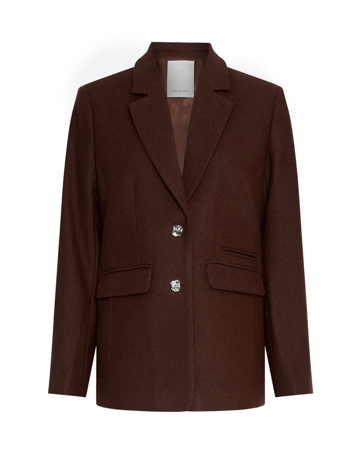 Mooie loose fit blazer met een losse oversized pasvorm, waardoor het een veelzijdige optie is voor verschillende gelegenheden. Deze blazer heeft zilveren knopen en een rijke, warme fudge kleur die heel gemakkelijk te combineren is met zowel casual als formele kleding.