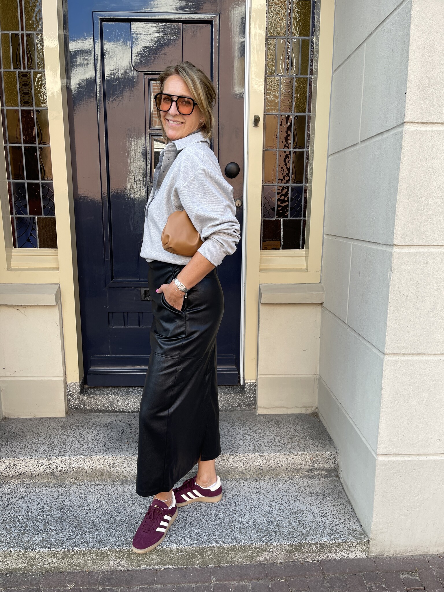 Deze blouse heeft een aparte asymmetrische knoopsluiting met luxe goudkleurige knopen die van de hals tot aan het manchet doorlopen. De opstaande kraag en lange mouwen met brede manchetten geven het geheel een moderne, verfijnde uitstraling.