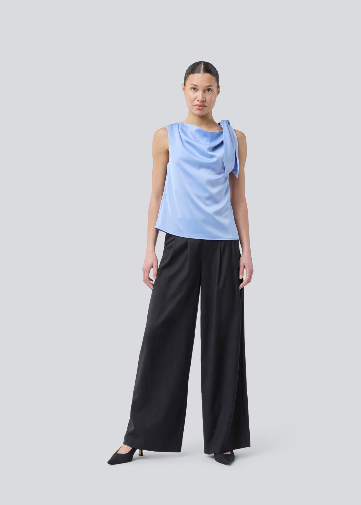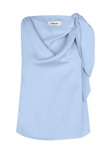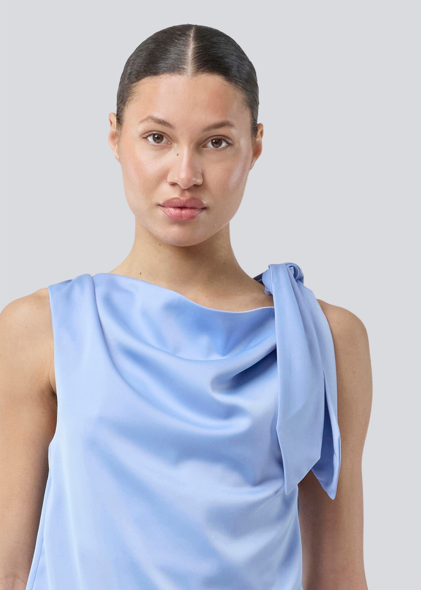 Satijnen top met watervaldetail bij de hals en een leuk strikdetail bij de schouder. Pasvorm is relaxed. Prachtige top voor een feestje, maar ook mooi op een jeans.