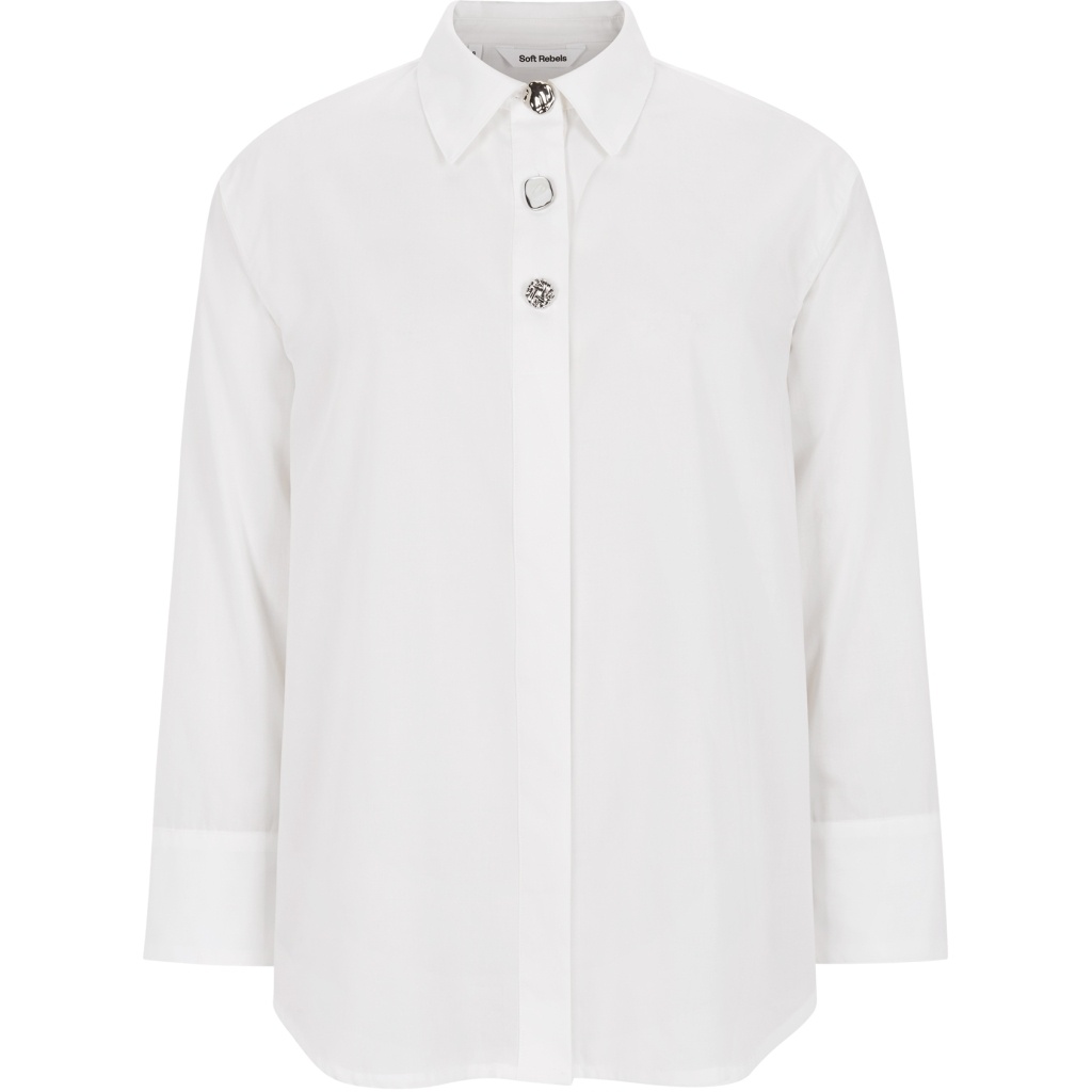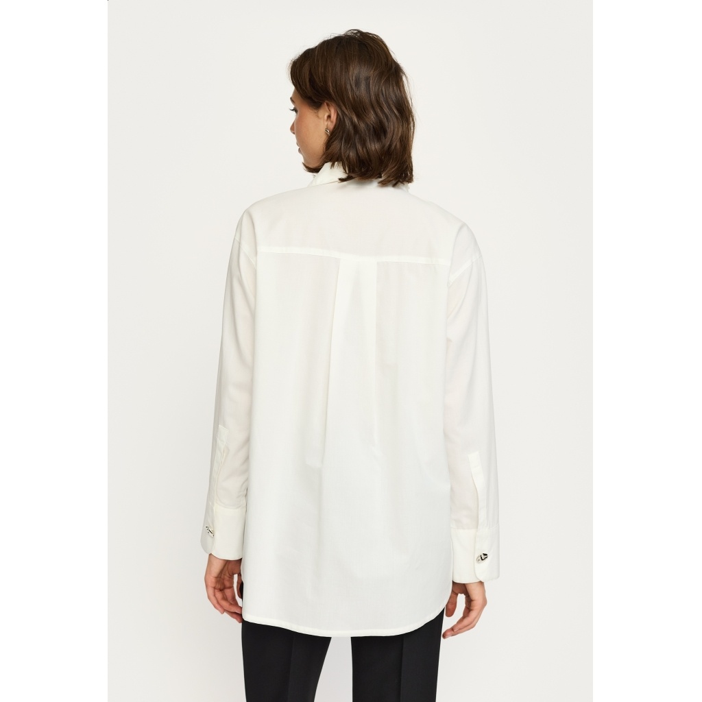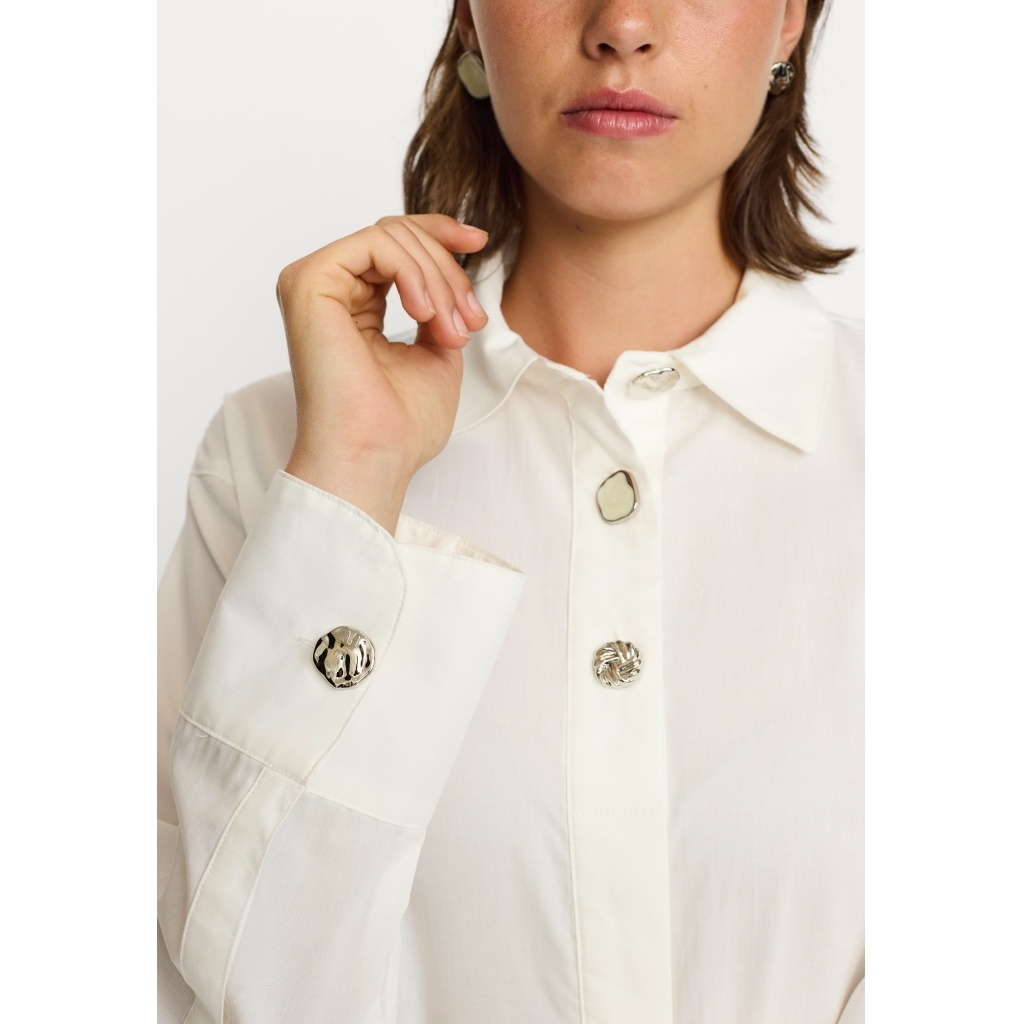 Deze blouse heeft een aparte asymmetrische knoopsluiting met luxe goudkleurige knopen die van de hals tot aan het manchet doorlopen. De opstaande kraag en lange mouwen met brede manchetten geven het geheel een moderne, verfijnde uitstraling.