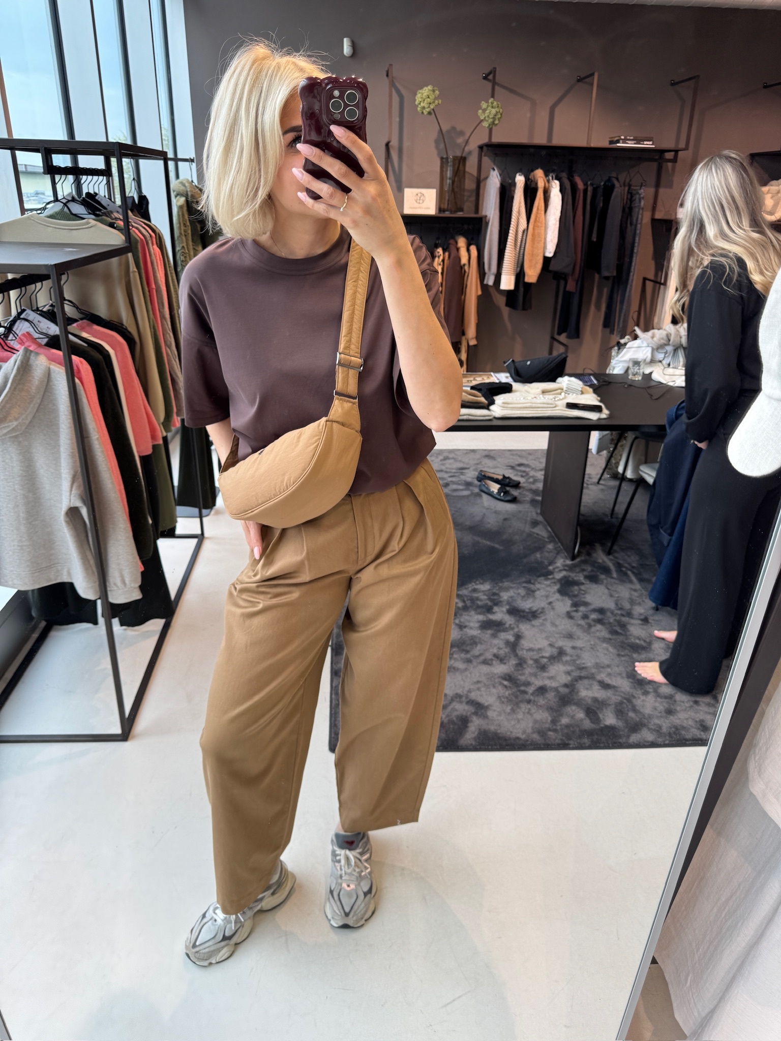 De Kinsey Melea Tee in Hot Fudge is de perfecte combinatie van comfort en effortless style.Gemaakt van zachte, ademende katoenmix en ontworpen met een flatterende pasvorm die moeiteloos te combineren is van casual jeans tot elegante rok.Een tijdloze basic met een vleugje luxe.