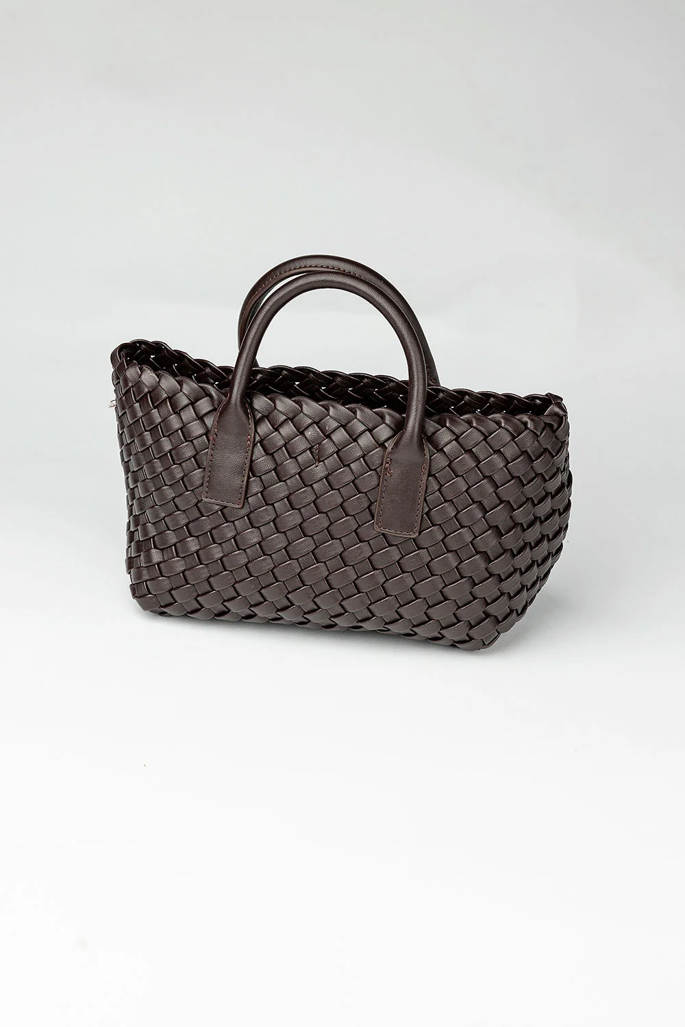 Mia Square Low Brown Bag is een compact, stijlvol accessoire gemaakt van gevlochten imitatieleder, ontworpen als een kleine, laagprofiel tas die perfect is om essentiële spullen mee te nemen met een chique, gestructureerde uitstraling.