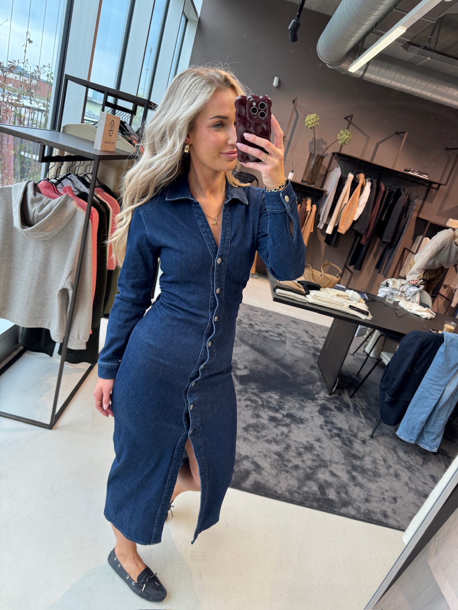 Mooie lange denim jurk met een klassieke overhemdkraag en een volledige knoopsluiting aan de voorkant. Het lange silhouet gecombineerd met gedefinieerde stiksels zorgt voor een tijdloze en strakke look, waardoor hij geschikt is voor zowel casual dagen als geklede gelegenheden. Style hem met sneakers voor een relaxte sfeer of combineer hem met laarzen en accessoires voor een meer verfijnde outfit.