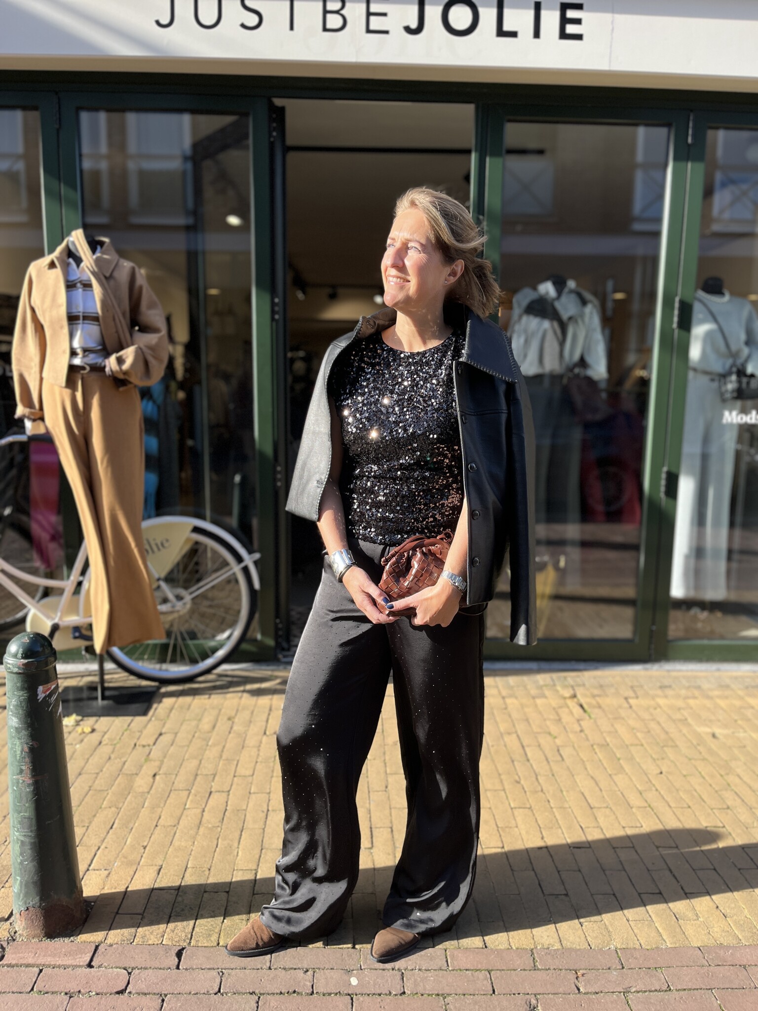 Laat je outfit stralen met de RoslynCC Sequin Top Black.Deze zwarte paillettentop heeft een strakke pasvorm en brede schouders, wat zorgt voor een krachtige, vrouwelijke look. De glinsterende pailletten vangen het licht bij elke beweging. Perfect voor een avondje uit of een feestje.
