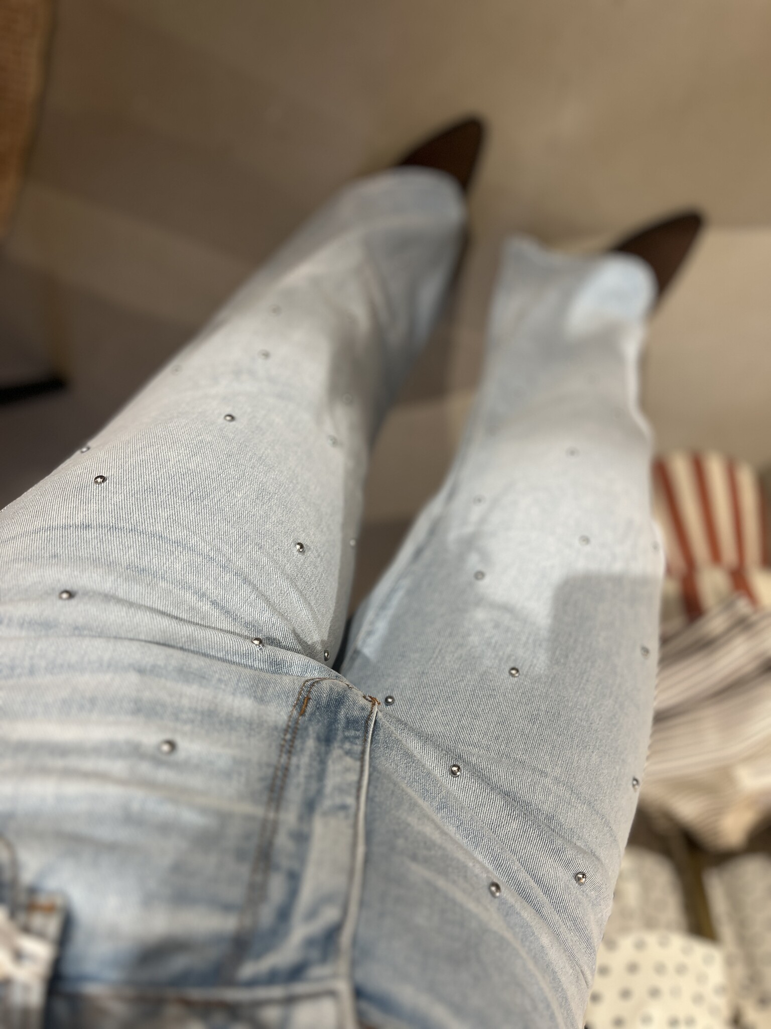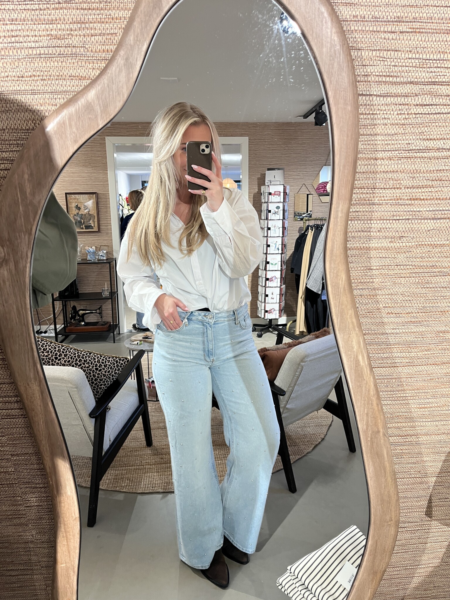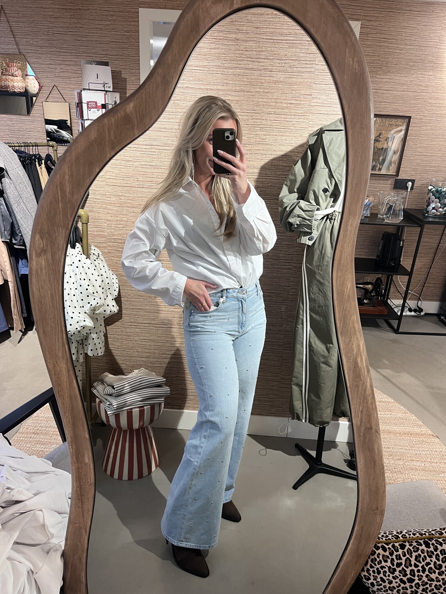 Deze high waist Sunny wide leg jeans met studs is dé eyecatcher van je outfit. De wijde pijpen geven de jeans een trendy, nonchalante uitstraling, terwijl de studs zorgen voor een stoere en speelse twist. Een perfecte mix van fashion en attitude. Combineer ’m met een basic tee voor een casual look, of ga all-out met een blouse of blazer voor een fashionable statement. Comfortabel, opvallend en helemaal on-trend – deze jeans laat je look gegarandeerd stralen