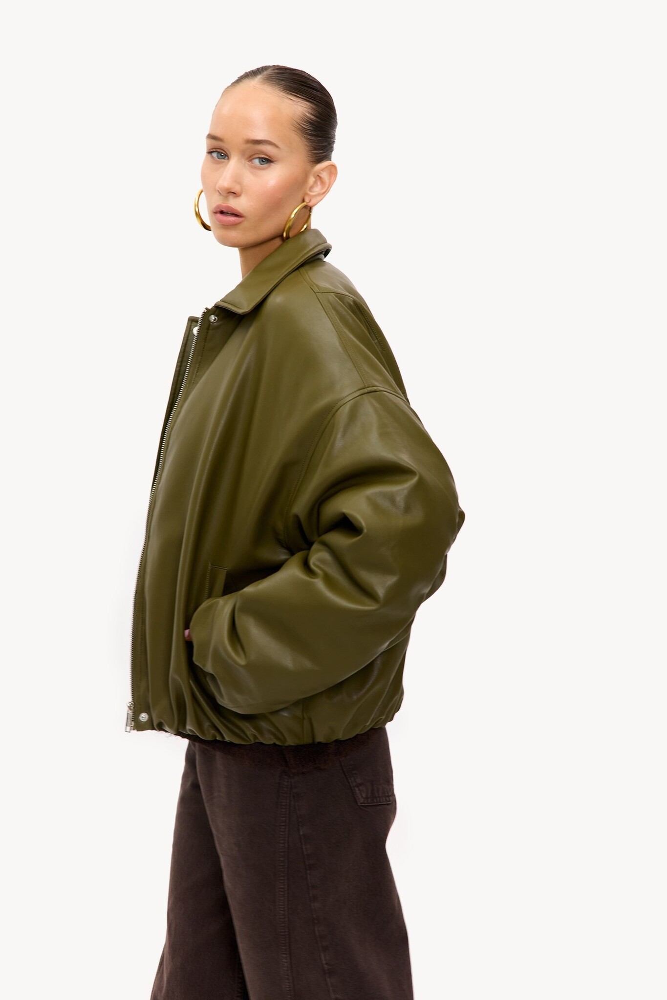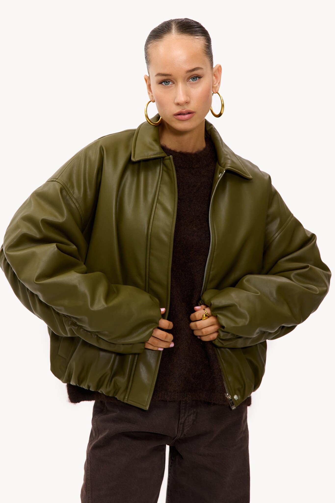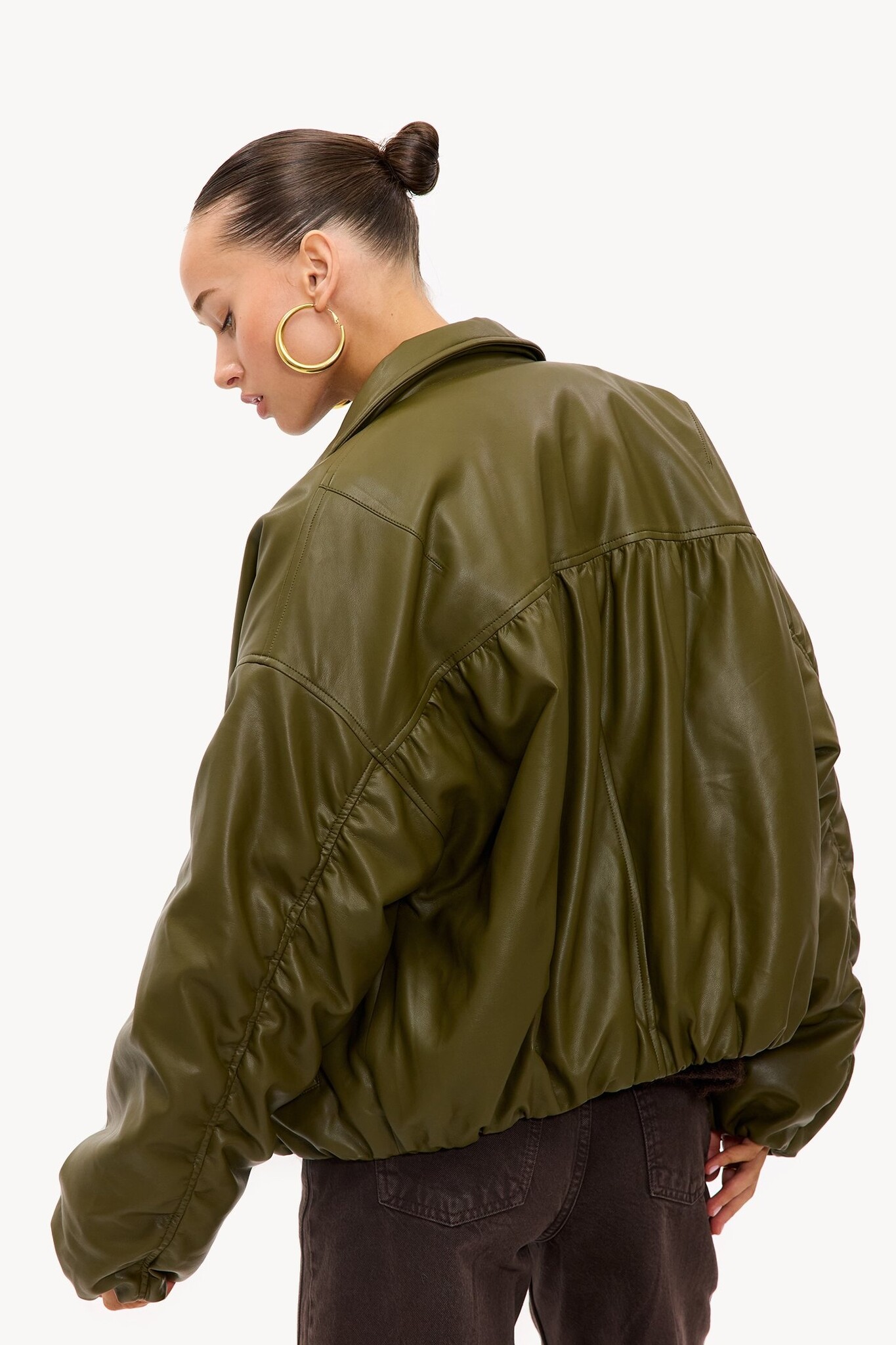 Dit groene bomberjack in lederlook heeft een oversized pasvorm met opvallende ballonmouwen.