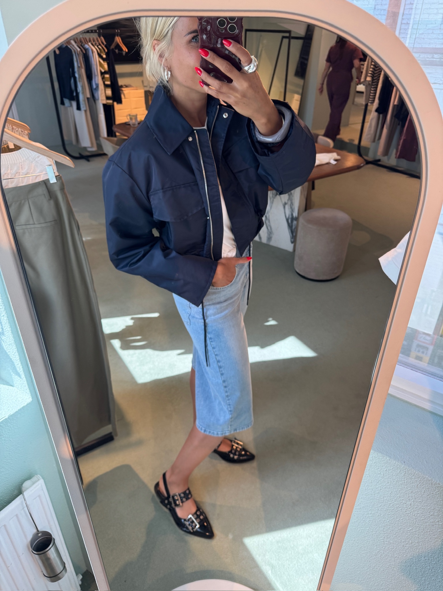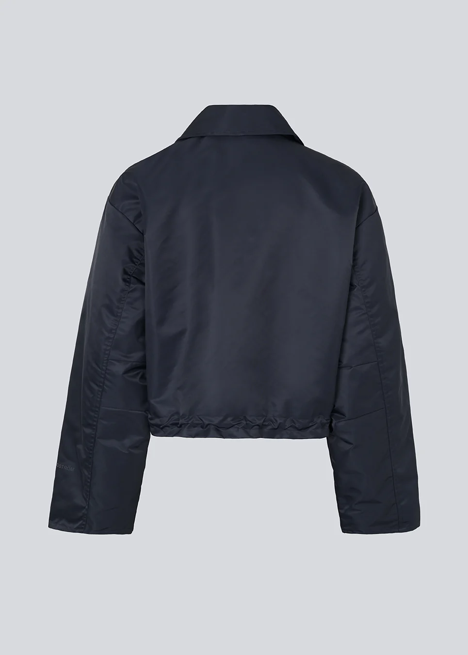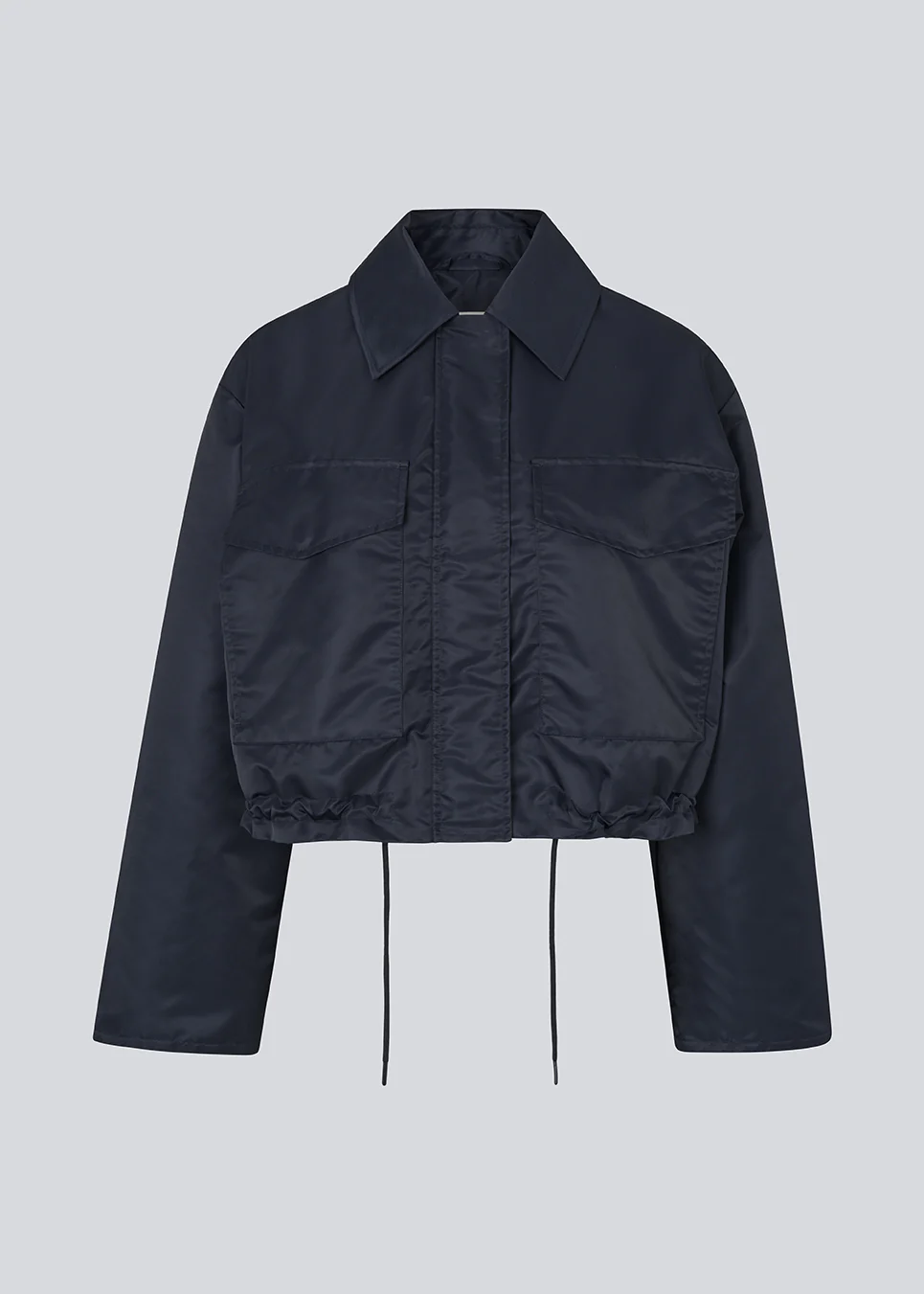 Kort jack in marineblauw met moderne en praktische details. Het Ulrikkemd jack heeft een klassieke kraag, grote klepzakken aan de voorkant, een verstelbaar trekkoord in de taille en is gemaakt van glanzend nylon, wat het een strakke en sportieve look geeft.