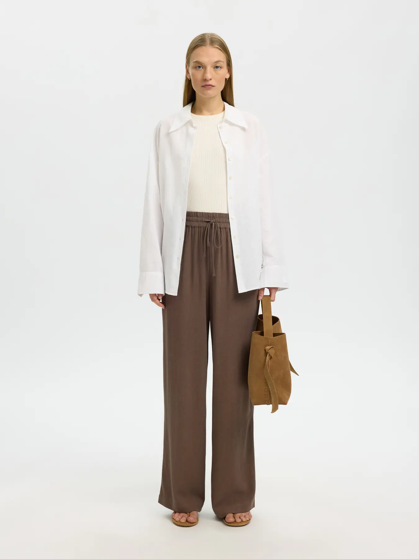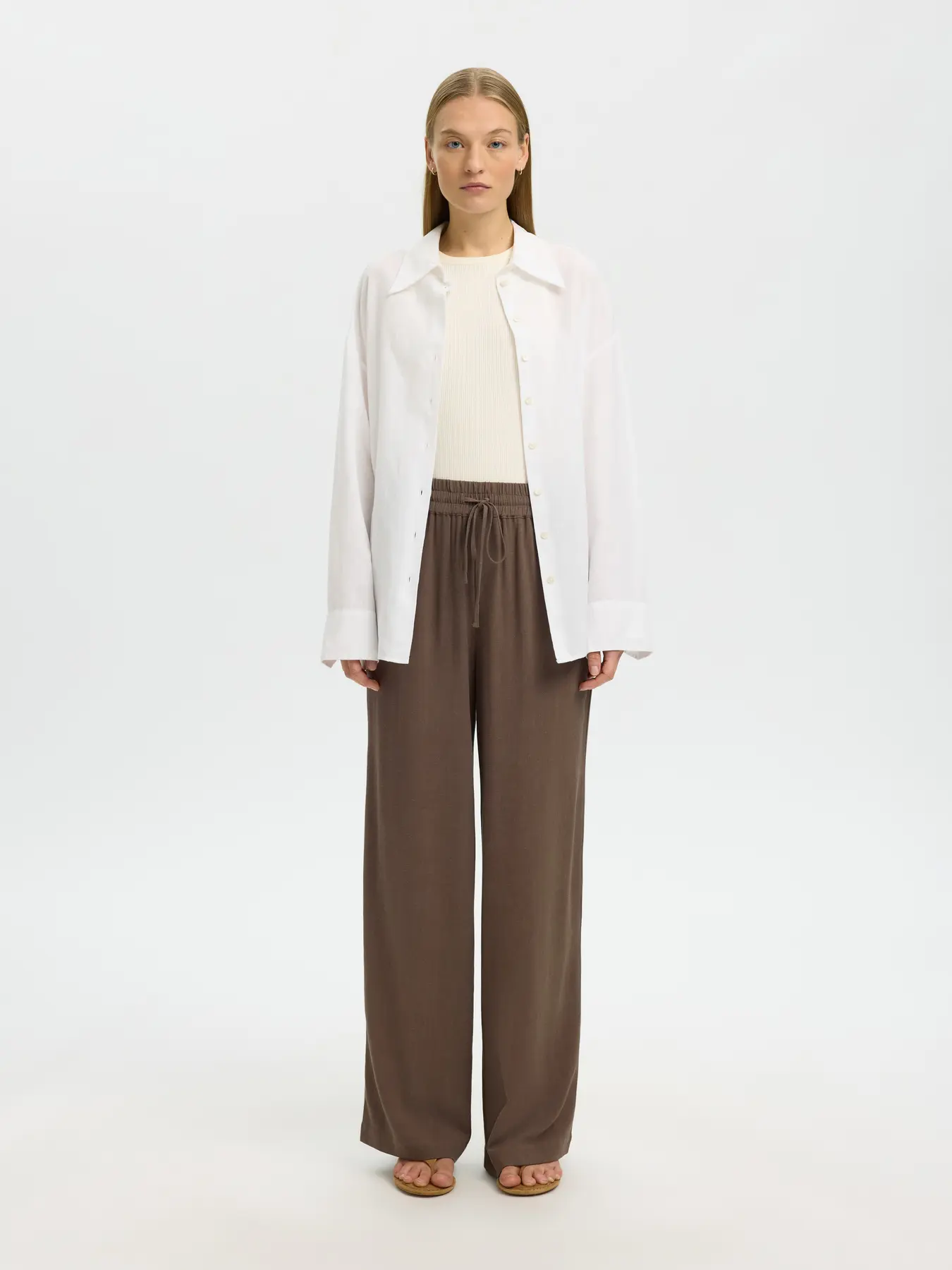 Deze broek met wijde pijpen heeft een relaxed silhouet en een flatterende hoge taille. Dankzij de praktische zijzakken en de verstelbare, elastische tailleband geniet je van extra comfort en een optimale pasvorm. Stijlvol, luchtig en ideaal voor zonnige dagen.